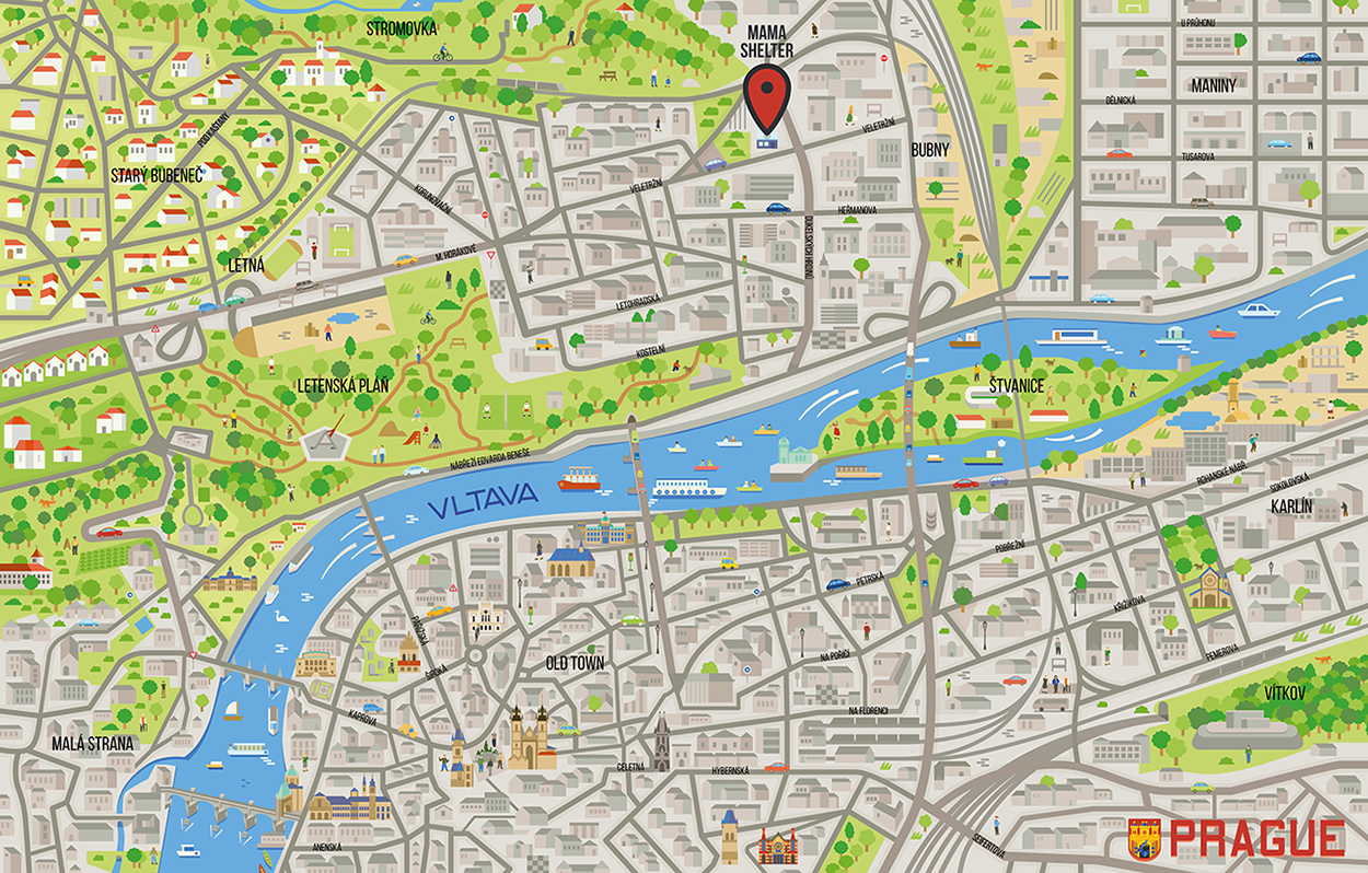 Custom illustrated maps of the cities of Belgrade and Prague for Hey Mama!, the new magazine for the Mama Shelter hotel chain. The mission was to show the city highlights on a very detailed environment, with lots of characters, while clearly presenting the street grid and the location of the hotel within the city.