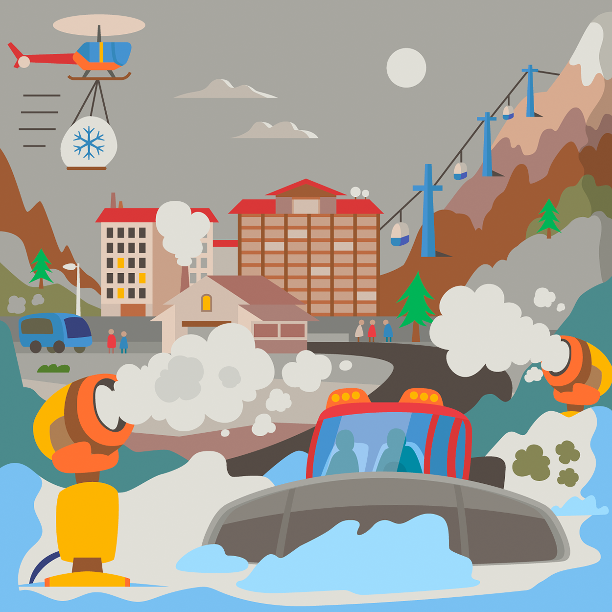 A series of illustrations about the effects of ski stations on climate change and viceversa. The original article also spoke about good practices that ski resorts can put into effect so skiing can become more sustainable.