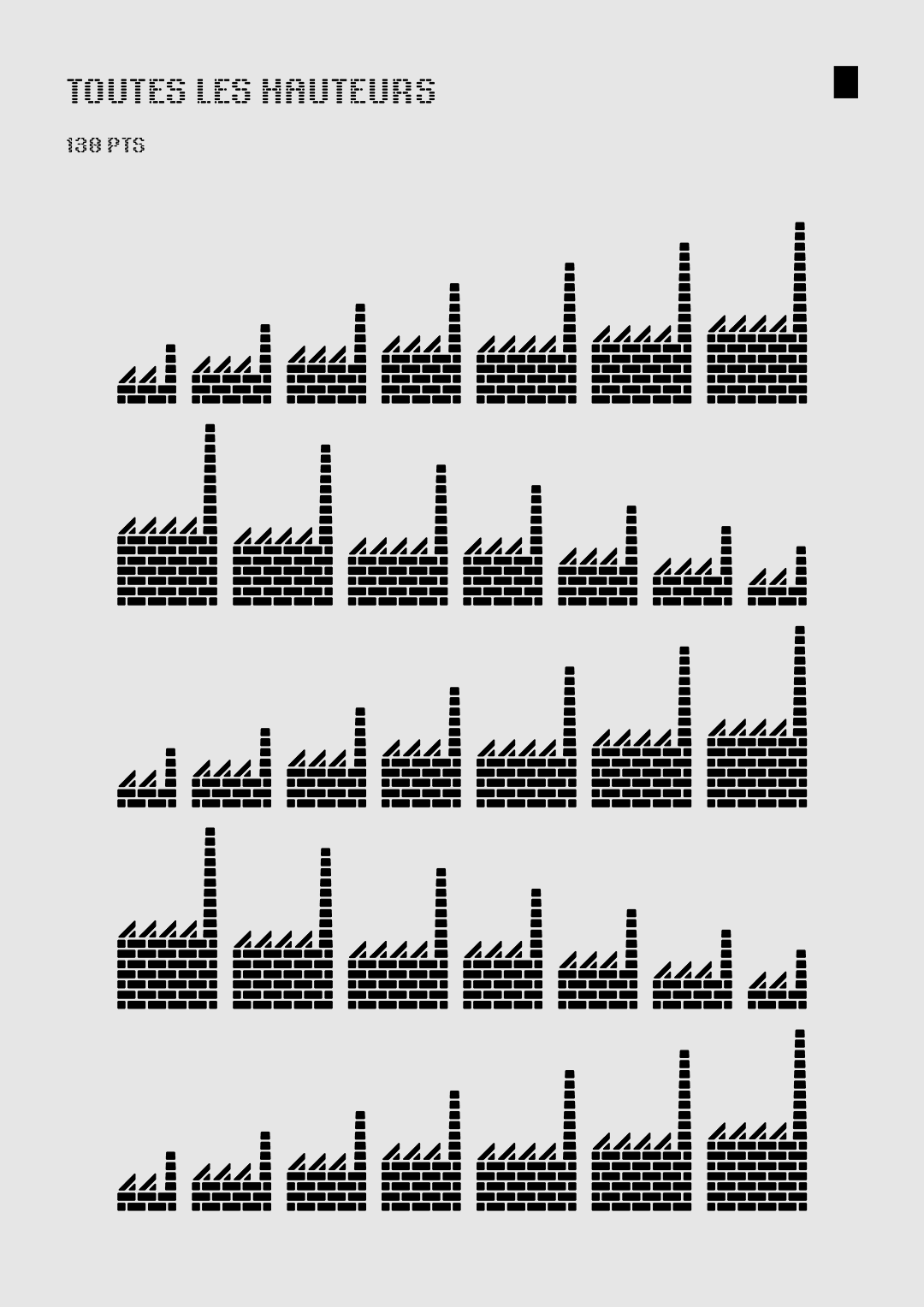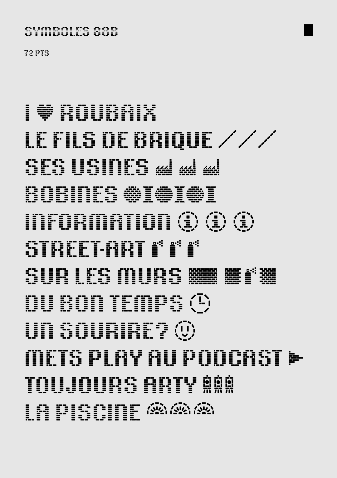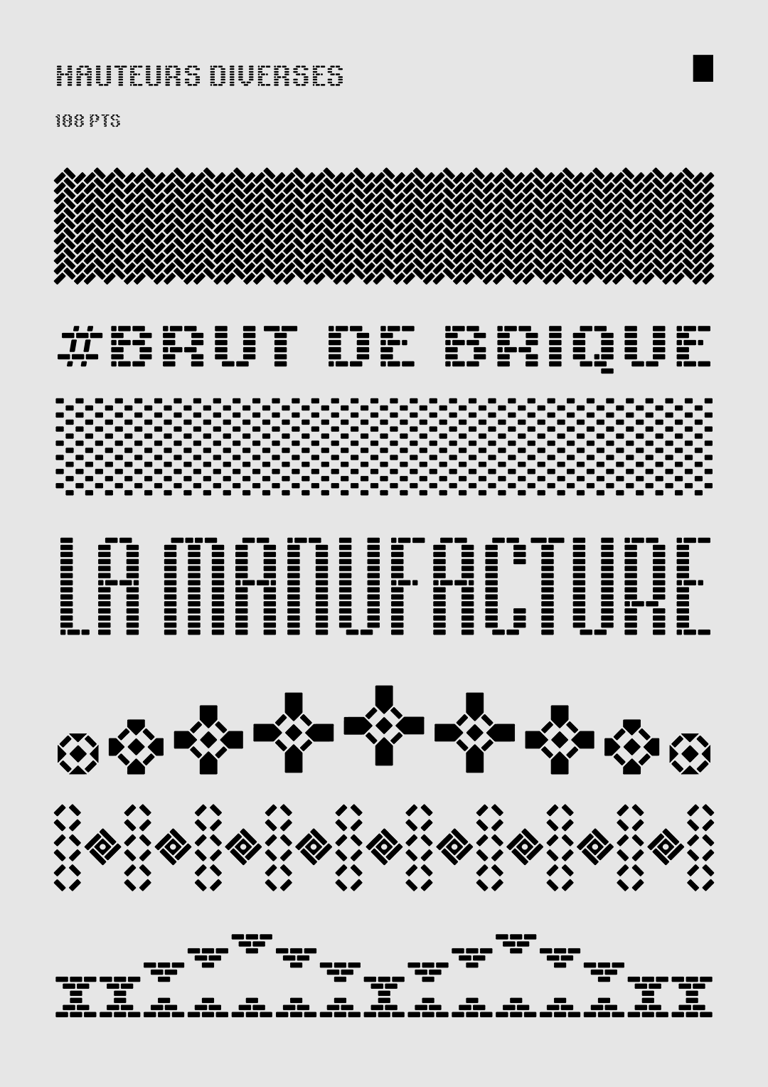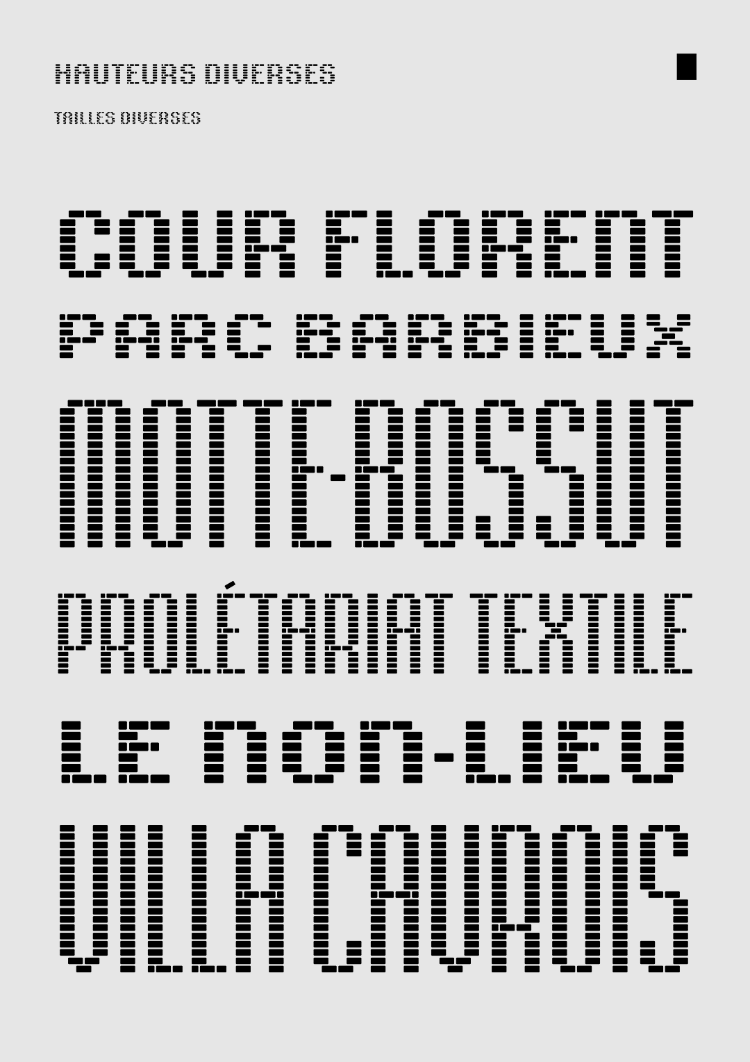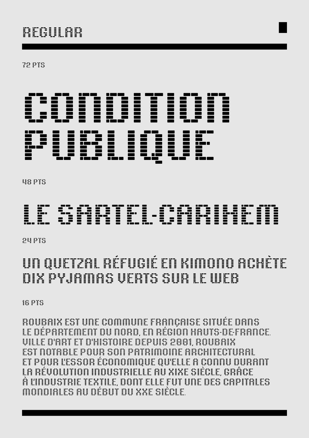 The I Love Roubaix typeface was developed at the request of the Roubaix Tourism Office and of the atelier Bien Vu. Its design is based on brick-shaped modules, as a reference to the predominant building method in the city. On its smaller optical sizes, its brick texture is reinforced with internal connections that recall the path of seams found in textile patterns. This way, this typeface creates a bridge between two main features of the city: brick architecture and textile industry. You can download "Roubaix Industrielle" (a libre/open-source version of the I love Roubaix typeface) on the Tunera Type Foundry.