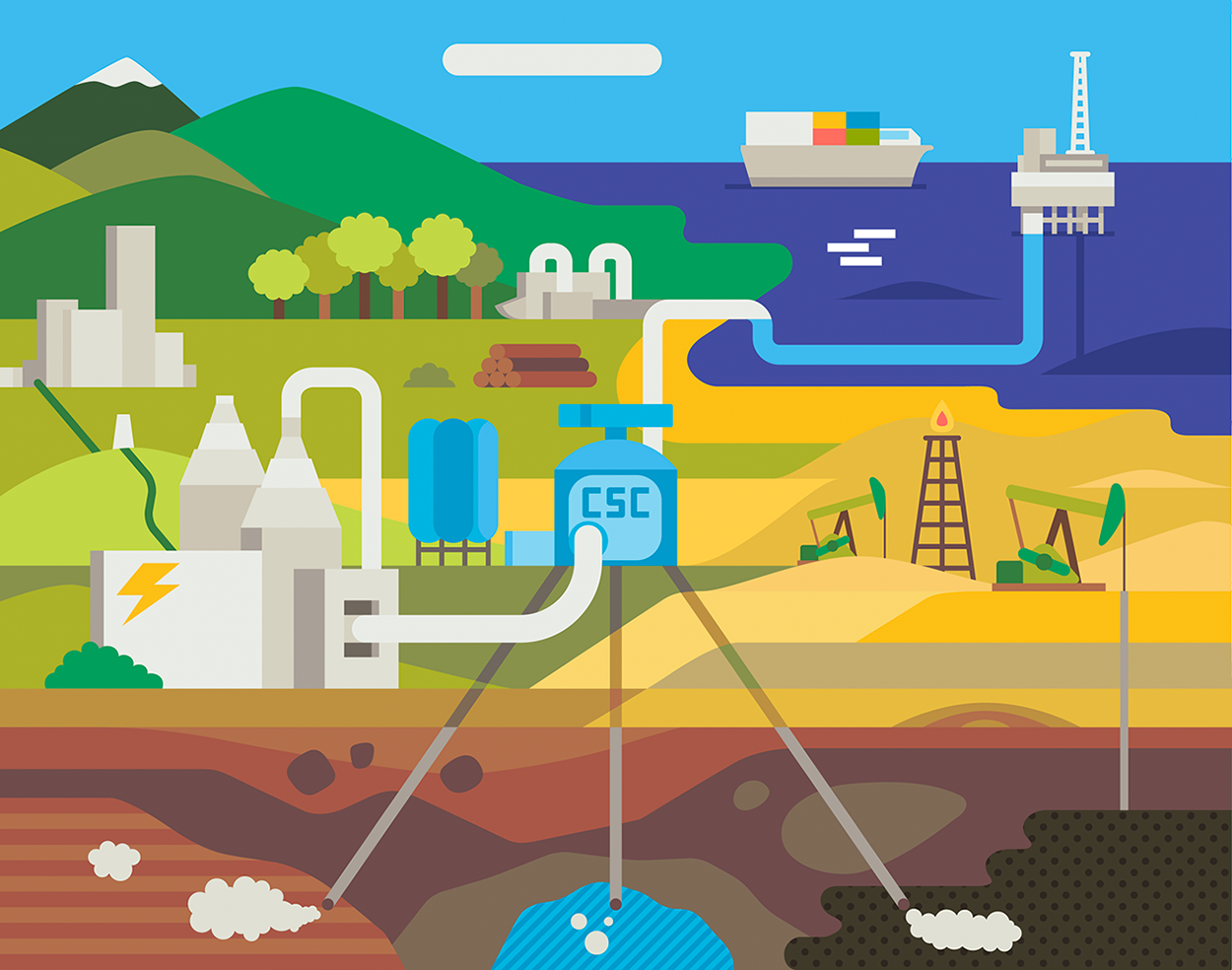 CSS (CSC in French) is "a technology that can capture up to 90% of the carbon dioxide (CO2) emissions produced from the use of fossil fuels in electricity generation and industrial processes" (according to the CCSa). This illustration for The Good Life magazine is partially inspired by a midcentury Petroleum Club mosaic by John Smith that was uncovered at the old Statler Hotel in Los Angeles in 2012.