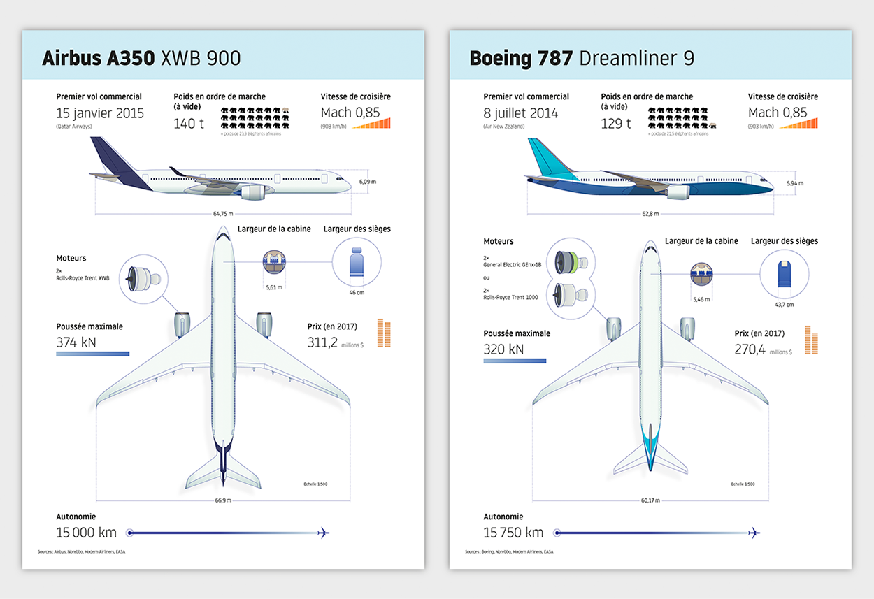 Side-by-side comparison infographic between two equivalent Airbus and Boeing planes. Data and pictures from many different sources were combined in order to reproduce the aspect of the planes and to present their main features.