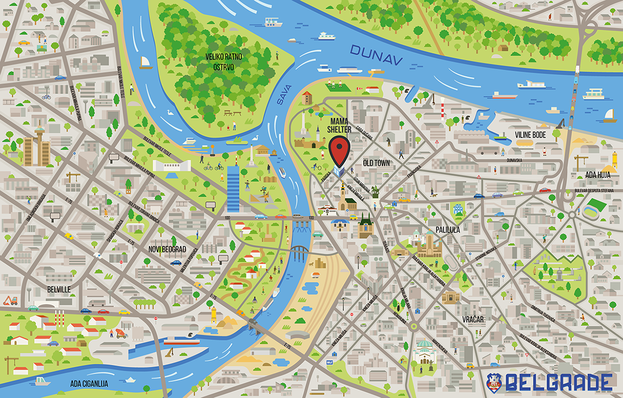 Custom illustrated maps of the cities of Belgrade and Prague for Hey Mama!, the official magazine for the Mama Shelter hotel chain. The mission was to show the city highlights on a very detailed environment, with lots of characters, while clearly presenting the street grid and the location of the hotel within the city.