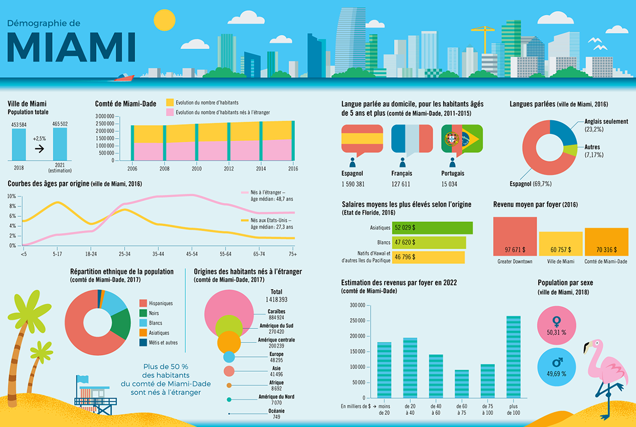A double-spread infographic for The Good Life magazine about the demographics of the Miami county and Miami DAE. The colour palette, with its pink and yellow tones, was inspired by the city's culture. Featuring the ever-growing skyline, a beach cabins and the notoriously elusive pink flamingo.