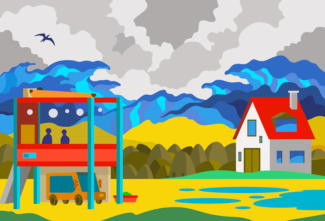 For this depiction of rising sea levels in the Atlantic due to climate change, a bold colour palette were used, as well as references to the local architecture and landscape of Normandy and to Hokusai's "The Great Wave off Kanagawa" print. The waves seem to float into mid-air as they loom over a disquiet scene, announcing impending doom.