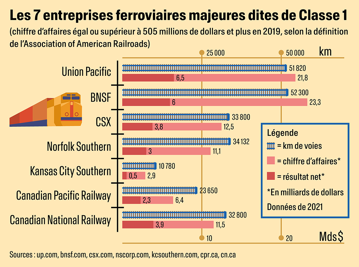 An infographic for The Good Life magazine comparing the seven major freight train companies in the US. Total rail lenghts, total revenue and net revenue of these companies are assembled in a two-axis chart, so the space the infographic takes on the page is optimized.
