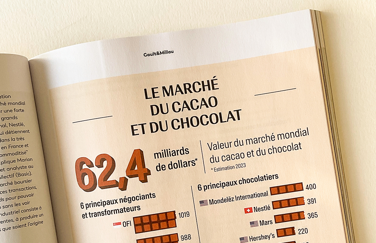 A series of infographics designed for the redesigned edition of the Gault&Millau magazine, dedicated to "seeing the world through gastronomy", according to their own words. The infographics offered a comprehensive overview of the global cocoa and chocolate market, covering everything from production and processing to sales.
